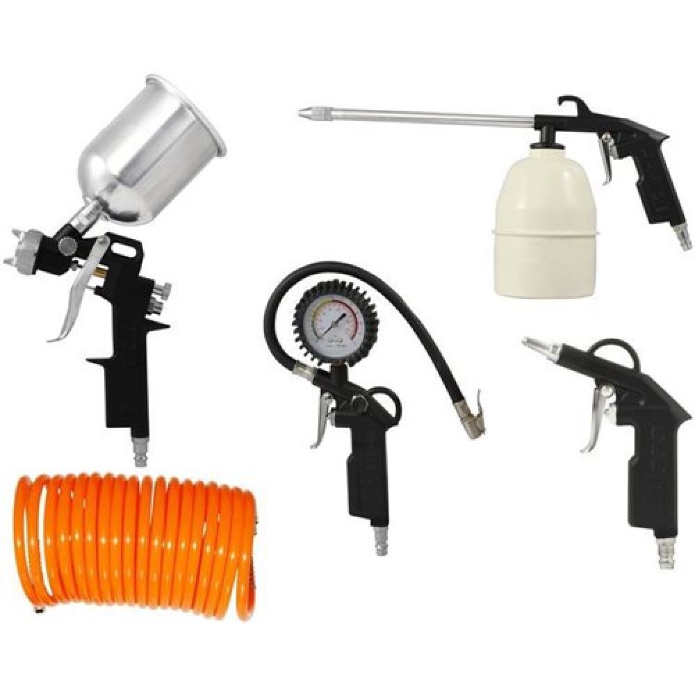 Deze luchtset bestaat uit 5 delen: bovenbeker spuitpistool, bandinflator, aluminium stroombeker, spuitpistolen met stalen bakken, spiraalslang van 5m, windbuks. Alle onderdelen zijn gemaakt van gegoten aluminium.