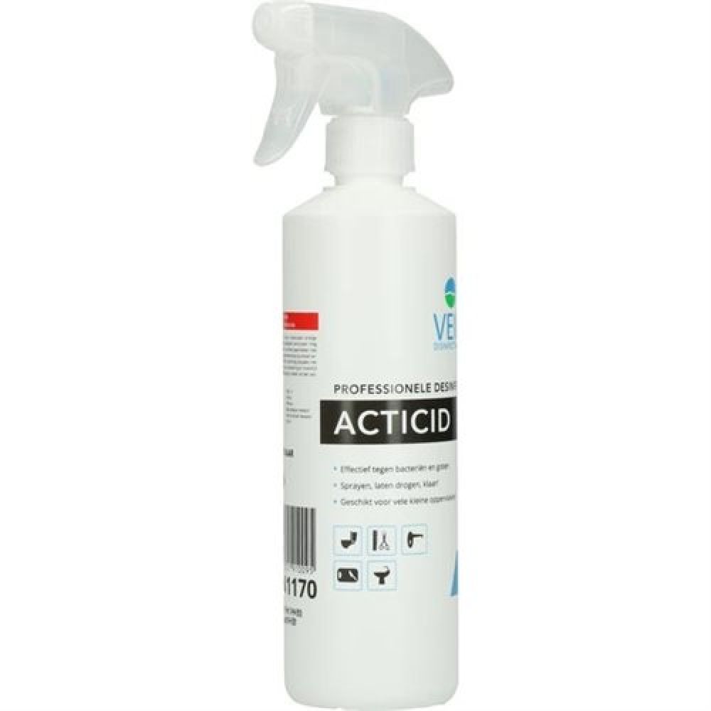 Acticid - 700mlDesinfectie product voor kleine oppervlakken.Acticid is een zeer doeltreffend desinfectie product voor kleine oppervlakken.Wat is Acticid?Acticid is een doeltreffend desinfectiemiddel op basis van 76% gedenatureerde ethanol (alcohol). Het kan worden toegepast voor de desinfectie van kleine oppervlakken (zoals deurknoppen, laarzen en toiletbrillen) in bijvoorbeeld de voedingsmiddelensector, gezondheidszorg, cosmetische- en veterinaire sector. Het kan overal ingezet worden om af te rekenen met ongewenste micro-organismen. Acticid is gemakkelijk in gebruik: sprayen, laten drogen, klaar! Naspoelen is niet nodig.De werkzaamheid wordt gegarandeerd door het hoge percentage ethanol, dat zijn effectiviteit heeft bewezen ten aanzien van bacteriën en gisten. Acticid zorgt ervoor dat het micro-organisme onherstelbaar wordt beschadigd (de ethanol zorgt ervoor dat het eiwit van het organisme coaguleert (stollingsreactie). Resistentie vorming is daardoor niet mogelijk. Gebruik biociden veilig. Lees vóór gebruik eerst het etiket en de productinformatie.Voordelen• Effectief tegen bacteriën en gisten• Sterk ontvettende werking• Laat geen residuen achter• Resistentie is niet mogelijk.Inhoud0,7 l5 lToelatingToelatingsnummer: 14021 NH