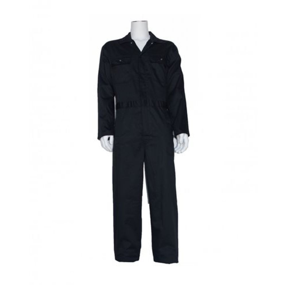 Overall polyester 65% / katoen 35%Doekgewicht 260gram m² .Verdekte 2-weg ritssluiting en elastiek in rug / taille.2 Borstzakken met klep, 2 zijzakken, 2 intasten, achterzak en duimstokzak.