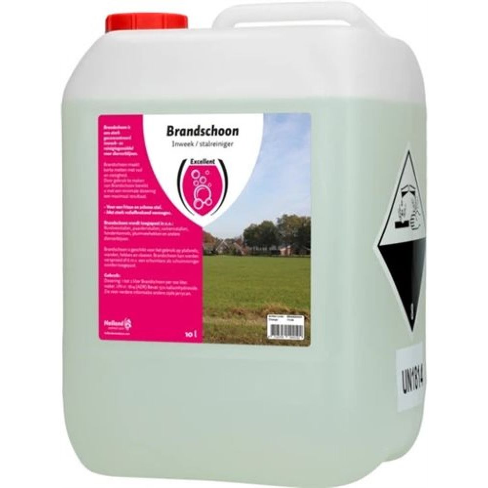 Brandschoon stallenreiniger - 10LInweek / stalreinigerBrandschoon maakt korte metten met vuil en viezigheid.Door gebruik te maken van Brandschoon bereikt u met een minimale dosering een maximaal resultaat. Te gebruiken in alle hondenkennels, rundveestallen, paardenstallen, pluimveehokken, kortom alle dierverblijven. Brandschoon is geschikt voor het schoon maken van plafonds, wanden, hekken en vloeren.Brandschoon kan worden gesprayd of d.m.v. een schuimlans als schuimreiniger worden toegepast.Samenstelling Diverse reinigende stoffen.Bevat o.a. 15% kaliumhydoxide.DoseringAfhankelijk van de vervuiling 1 tot 2 liter Brandschoon per 100 liter water.Opbrengen met lage druk.Na een inweektijd van 30 tot 60 minuten met hogedruk (40 tot 80 atmosfeer) afspuiten. Voor toepassing eerst mestkorsten lossteken van vloer en wanden.H