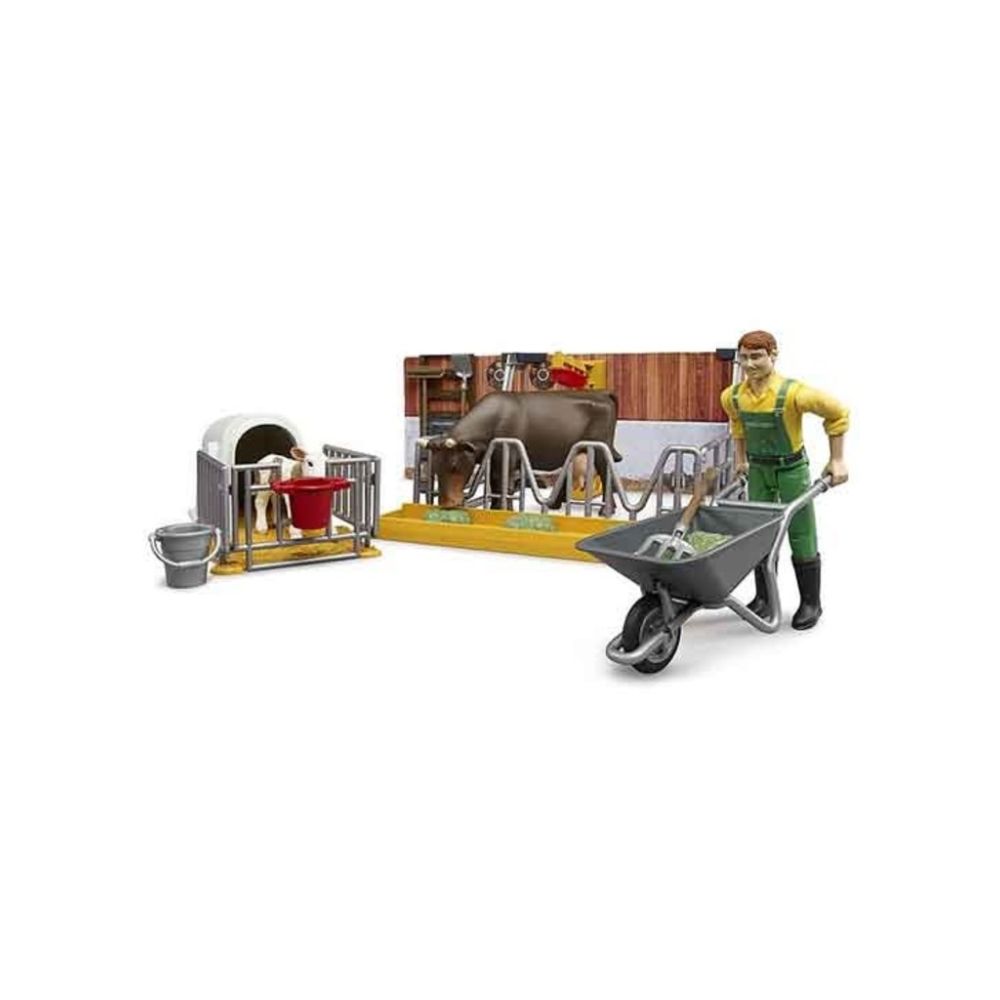 Bruder boer met kalverstalInhoud:- Complete koeienstal- poppetje (boer) met kruiwagen- Kalveriglo met kalf- verschillende accessoires