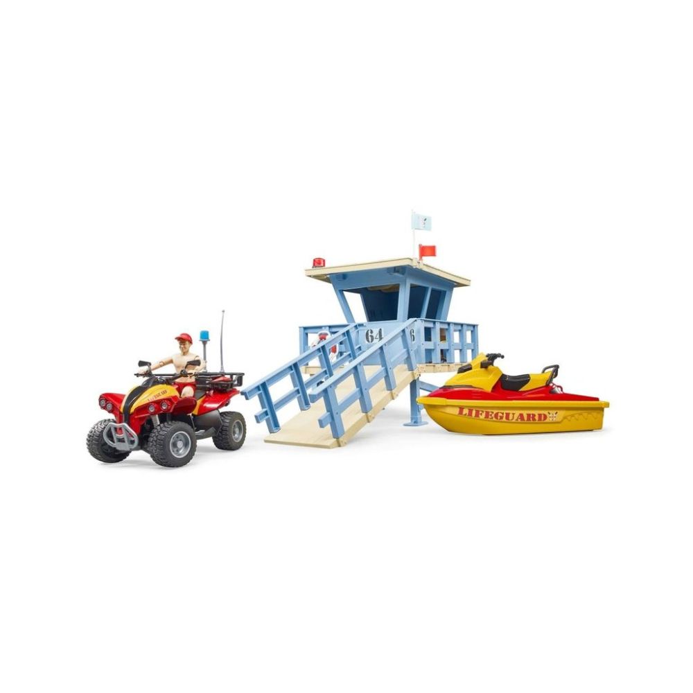Bruder strandwacht met torenRecreatie en sport op en in het water zijn voor BRUDER erg belangrijk in de vrijetijdswereld. Vanaf nu zijn de bworld Life Guard en zijn station verantwoordelijk voor de veiligheid van alle bworld watersporters. Haar taak is het herkennen, begrijpen en handelen in gevaarlijke situaties op en in het water. Het Life Guard Station is uitgerust met het nieuwe zwaailicht om gevaarlijke situaties te signaleren. De nieuwe Life Guard Quad is beschikbaar voor het snel bereiken van locaties op het strand. De badmeester gebruikt de Water Craft voor operaties in het water.Als perfecte aanvulling op het Life Guard Station heeft BRUDER ook de nieuwe bworld lifeguard met stand-up paddle en de RAM Power-trolley in Life Guard-versie met figuur en SUP.Inhoud:- Reddingstoren met uitrusting en afneembaar dak bijvoorbeeld van bovenaf- Badmeesters met accessoires- Life Guard Watercraft- Reddingswacht Quad- Zwaailamp art.nr. 02807Algemene specificaties: - Aandacht! Niet geschikt voor kinderen jonger dan 36 maanden. Verstikkingsgevaar door kleine onderdelen die kunnen worden ingeslikt.- Aanbevolen leeftijd: geschikt vanaf 4 jaar om binnen en buiten te spelen- gemaakt van hoogwaardige kunststoffen zoals ABS\- Compatibel met bworld-figuren- Gemaakt door bruder- schaal 1:16