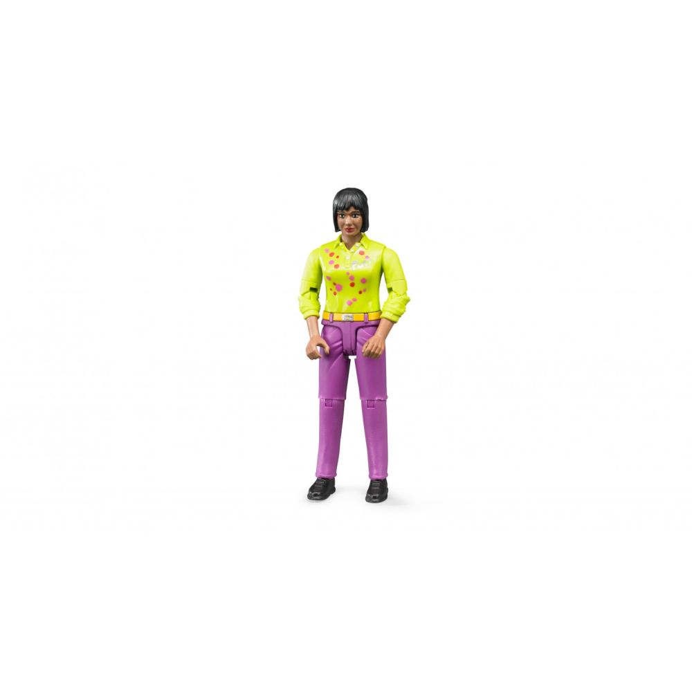 Bruder bworld vrouw met een paarse broek, groen shirt en donkere huidskleur. Verschillende delen van de vrouw kunnen bewegen en de handen kunnen verschillende objecten vasthouden of vastpakken.