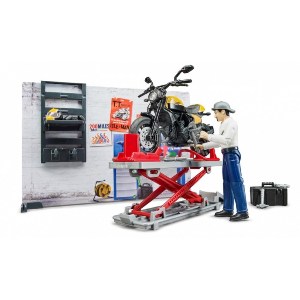 Bruder werkplaats voor motoren en Ducati ScramblerDeze set bestaande uit een Ducati Scrambler motor, motorheftafel, achterwand met gereedschappen afgebeeld, monteur met gebreedschap, helm en handschoenen. Deze werkplaats set is voor echte motor liefhebbers! De motorheftafel is verstelbaar zodat je er op elke manier aan kan sleutelen. De motor heeft de kleuren geel en zwart.Deze speelgoed set is onderdeel van de Bruder Profi-serie. De set heeft veel realistische details. De speelset is gemaakt van hoogwaardig kunststof en uitgevoerd op schaal 1:16.