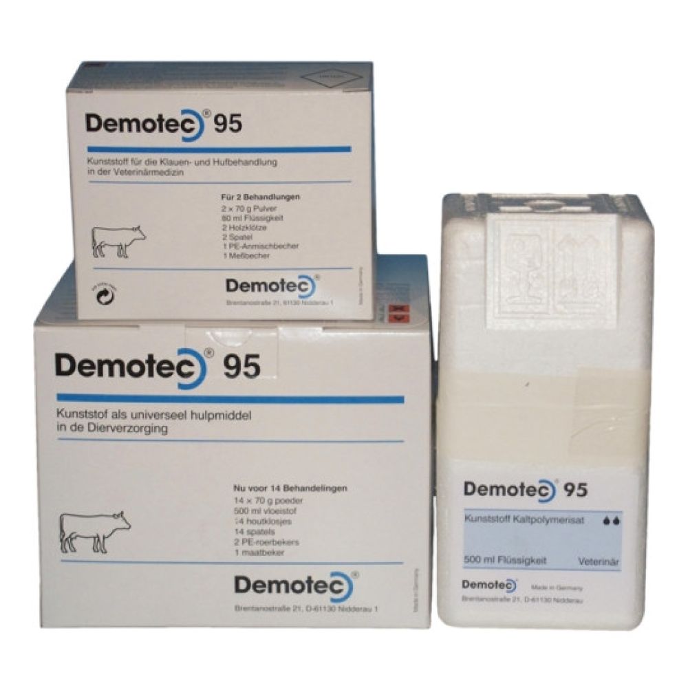 Demotec 95 - 14 behandelingenMet dit klauwverzorgingspakket kunt u 14 klossen plakken.Het pakket bestaat uit:14 zakken poeder, 500 ml vloeistof, 14 klossen, 14 spatels en 2 PE-roerbekers.Voordeel van Demotec 95 is dat het niet plakt aan de handen en is daardoor ideaal te boetseren en te kneden!H