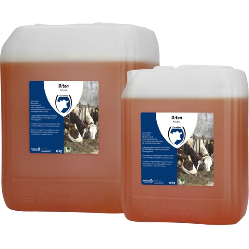Diton - 25kgDrenchproduct voor melkvee ter vermindering van het risico op slepende melkziekte.Diton is uniek omdat Diton na 3 dagen verstrekken het risico op slepende melkziekte wegneemt. Bij zowel veehouders als bij deskundigen al jaren een geliefd product.ToepassingTer vermindering van het risico op slepende melkziekte.VoederadviesRund: 2 x daags 300 ml gedurende 3 dagenSchaap / geit: 2 x per dag 100 ml gedurende 3 dagenH