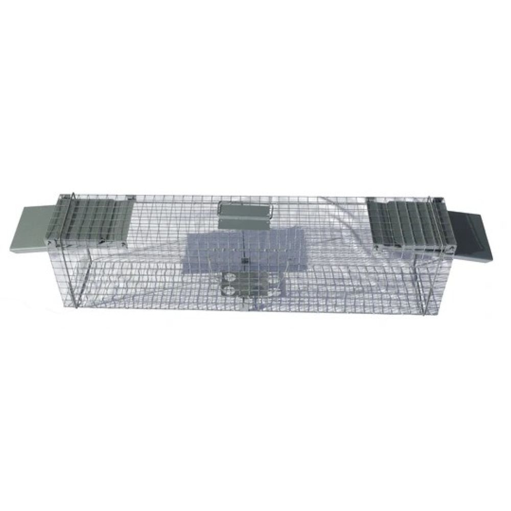 Doorloopval rat, marter, bunzing, kat - 102x20x27cmDoorloopval om ratten, marters en zelfs bunzings mee te vangen!Zodra de doorloopval gezet is zal een dier op het lokaas afkomen. Wanneer geprobeerd wordt om te eten zal het desbetreffende dier op het plateau moeten gaan staan. Zodra het plateau beweegt zullen de ijzeren pinnen aan de zijkant van de kooi van elkaar af schieten. Op dat moment vallen de kleppen aan beide kanten van de kooi dicht. De kleinere klepjes zullen op het weerhaakje rusten zodat het dier geen mogelijkheid heeft om te ontsnappen. De val is gemaakt van gegalvaniseerd staal. TipsHet is mogelijk om vier eieren in de gaten van het plateau te zetten als lokmiddel. Doe dit wel voordat u de val gaat zetten.Om nog sneller en efficiënter plaagdieren te vangen met deze doorloopval kunt u de bodem van de val bedekken met zand en bladeren. Door een doek of takken over de val te leggen is er minder licht en zullen plaagdieren eerder in de val lopen. Gebruik bij het zetten van de val altijd handschoenen zodat de geur van mensen niet aan de val zit. Maakt u al gebruik van het perfecte lokaas? Gebruik onze Knock Off Reward Pellets!H