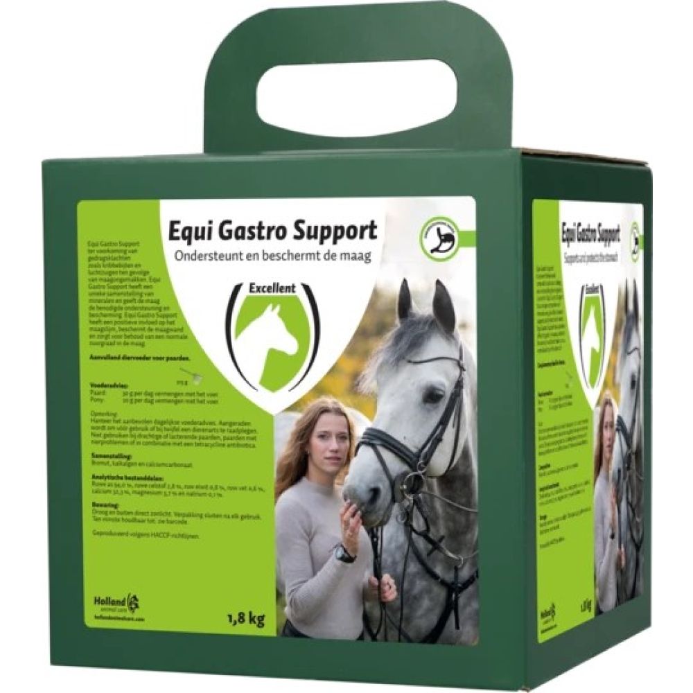 Equi Gastro Support voor ondersteuning van de maag en behoud van een normale zuurgraad!Aanvullend diervoeder voor paarden.Equi Gastro Support bevat een unieke en effectieve samenstelling met specifieke ingrediënten. Kalkhoudende alg zorgt voor ondersteuning en behoud van een normale maagzuurgraad en het neutraliseren van overdadige maagzuurvorming. Calciumcarbonaat zorgt voor het neutraliseren van de maaginhoud om de maag tot rust te brengen.Equi Gastro Support heeft een maagslijm versterkende invloed en beschermt de maagwand.Equi Gastro Support ter voorkoming van gedragsklachten zoals kribbebijten en luchtzuigen ten gevolge van maagongemakken. Ondersteunt effectief bij maagongemak met zichtbaar resultaat. VoederadviesVoor een optimale toepassing bij (acute) maagongemakken: verstrek het product voor een duur van 60 opeenvolgende dagen.Â