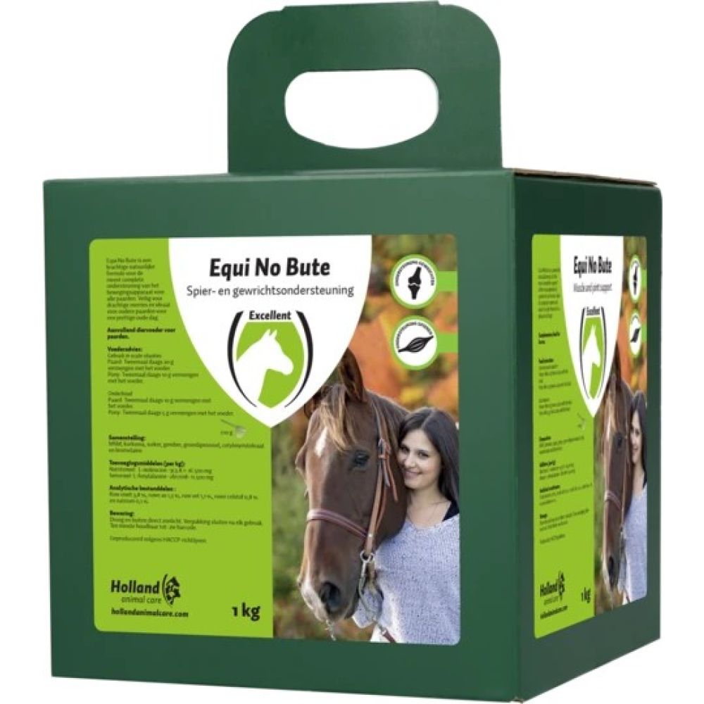 Equi no bute - 1kgEqui No Bute is een krachtige natuurlijke formule voor de meest complete ondersteuning aan het bewegingsapparaat! Aanvullend diervoeder voor paarden.Equi No Bute bevat o.a. MSM, kurkuma, gember, omega-3 en bromelaïne welke bekend staan om de natuurlijke ondersteunende eigenschappen.Equi No Bute is vrij en veilig te gebruiken bij alle (sport-) paarden. Zeer geschikt voor drachtige merries en oudere paarden die extra comfort en ondersteuning nodig hebben. Combineer Equi No Bute + Equi Mobility Plus voor de krachtigste aanpak! Groenlipmossel en kurkuma worden al jaren met succes toegepast in de paardensport. Uitstekend geschikt voor• Paarden op leeftijd• Drachtige merries• Paarden met overgewicht• Prestatiepaarden (sport- en werkpaarden) VoederadviesGebruik in acute situatie:Paard: 20 g 2x per dag.Pony: 10 g 2x per dag. Onderhoud:Paard: 10 g 2x per dag.Pony: 5 g 2x per dag.H