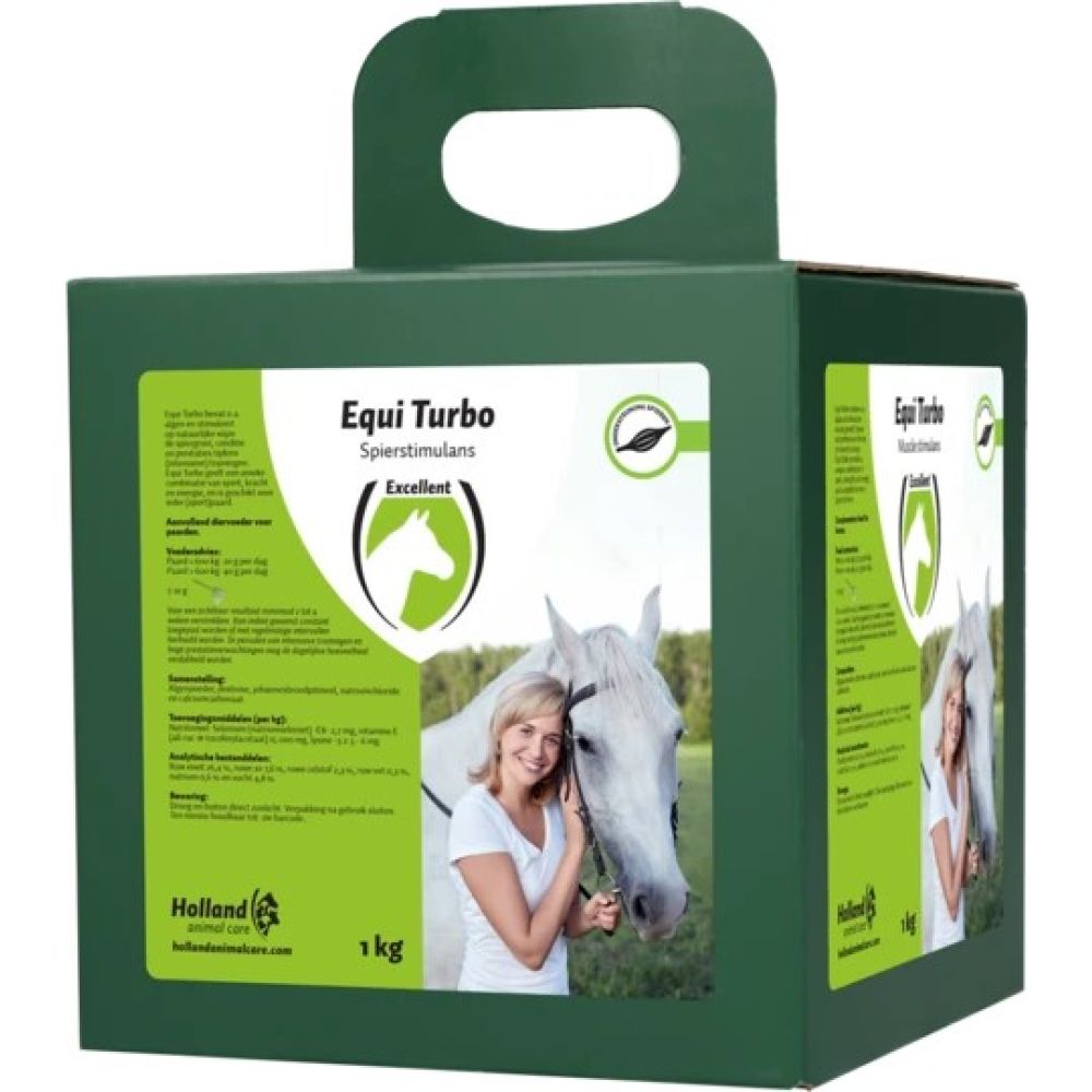 Equi turbo muscle stimlans - 1kgEqui Turbo is het topproduct voor de spieropbouw van paarden. Aanvullend diervoeder voor paarden. Stimuleert op een natuurlijke wijze de spiergroei, spieropbouw en verhoogt de prestaties van het paard!De gekweekte algensoort in de Equi Turbo is zeer rijk aan vitaminen, mineralen en aminozuren voor opbouw en bescherming van de spieren.  Gekweekte algensoortIs zeer rijk aan eiwitten, vitaminen, mineralen en aminozuren.Perfect voor bescherming van de spieren tijdens intensieve training en verhoogt het uithoudingsvermogen. Equi Turbo• Vergroot het uithoudingsvermogen en bevordert de prestaties van het paard.• Draagt bij aan een goede afvoer van de afvalstoffen voor snel herstel na inspanning.• Is rijk aan aminozuren, de bouwstenen voor sterke spieren.• Voor spirit, kracht, en energie en is vrij en veilig te gebruiken bij alle (sport-) paarden. Sterk in groei, spieropbouw en prestatie. Gaat verzuring tegen. Uitstekend geschikt voor• Jonge paarden in ontwikkeling• Prestatiepaarden (sport- en werkpaarden) VoederadviesRichtlijn per dag:Paard > 600 kg: 40 gPaard < 600 kg: 20 g Voor een zichtbare werking minimaal 2 tot 4 weken verstrekken.Equi Turbo kan indien gewenst constant toegepast worden of herhaald worden met regelmatige intervallen. In periodes van intensieve trainingen en hoge prestatieverwachtingen mag de dagelijkse dosering verdubbeld worden.H