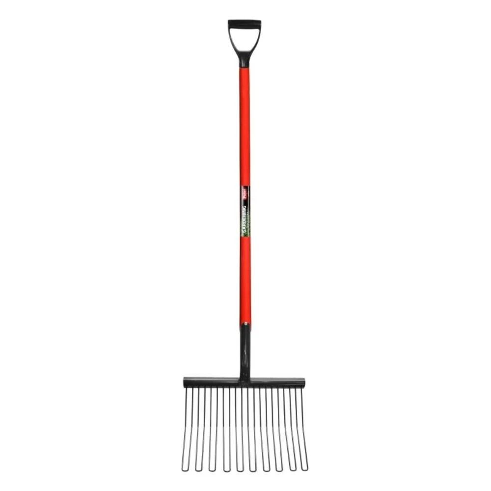 Fynalite spaanders vork rode D-steelLicht, sterk en evenwichtig spaanders vork. Gehard en getemperd verenstaal tanden Hardhout handvat.120cm lang handvatTotale lengte 143cmKop 33cm breedD handvat 100cmTotale lengte 124cmKop 32cm breed