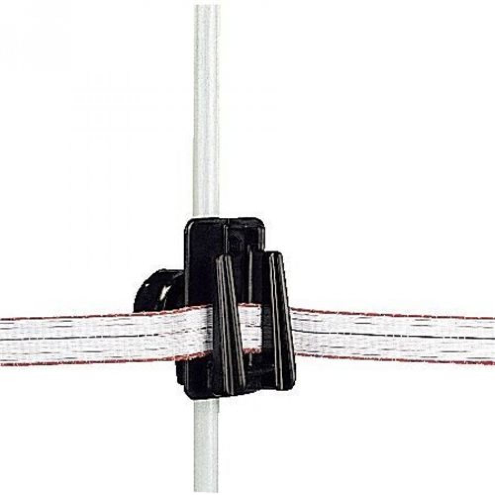 Voor het toevoegen van een extra draad/cord (tot 8mm) of lint (tot 40mm) op ronde of ovale verplaatsbare palen met een maximale Ø 12,5mm. Past uitstekend op de Gallagher veerstalen en kunststof palen.