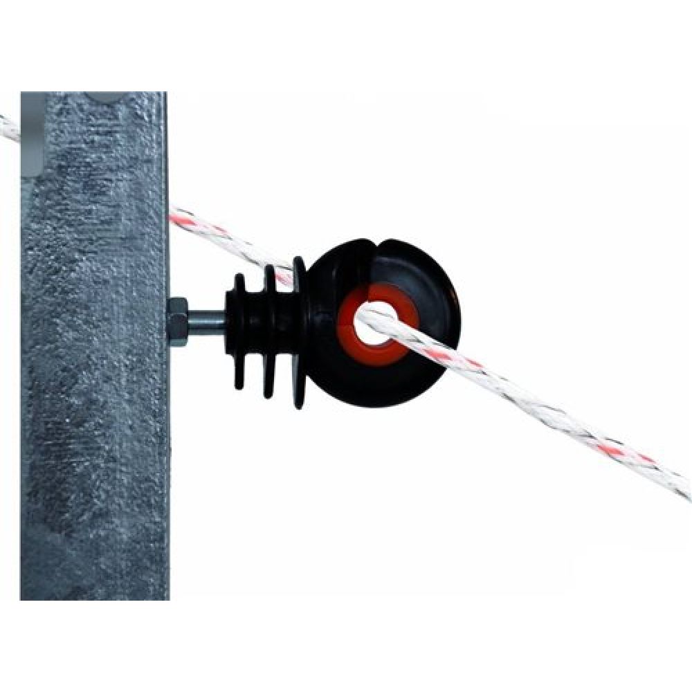 Zeer solide schroefisolator met metalen kern. Door de oranje ring is de stand tussen de kern en de geleider overal gelijk, waardoor kortsluiting nihil is. Geschikt voor de toepassing van kunststof draad en cord op een metalen paal.