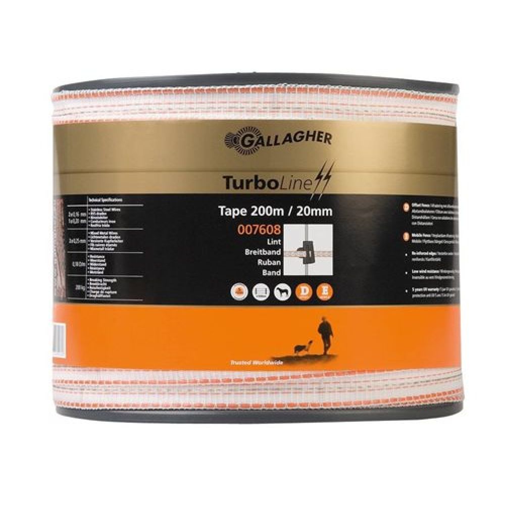 Gallagher TurboLine Lint 20mm Wit 200mZeer stevig TurboLine lint met versterkte rode randen, bestemd voor semi-permanente paardenafrasteringen. De unieke samenstelling (3 dikke roestvrijstalen draden en 2 lichtmetalen draden) zorgt voor 40x betere geleiding dan het standaard 20mm lint.
