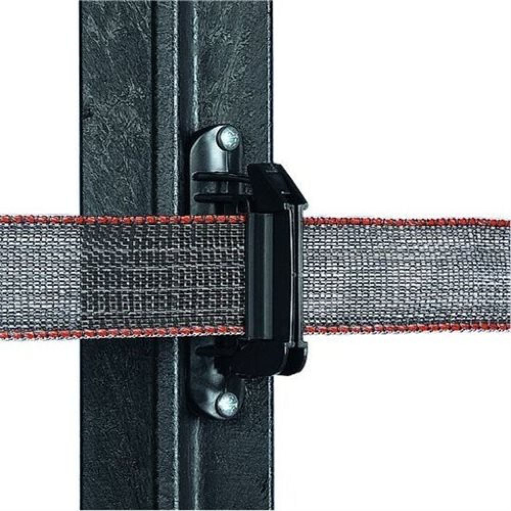 Een zeer fraai vormgegeven lintisolator die lint tot 40mm klemt tussen 2 vaste rubberen delen. Deze delen zorgen voor een stabiele bevestiging van het lint en verlengen de levensduur. Het lint kan in 1 klik vastgezet worden en de meegeleverde schroef kan gebruikt worden als extra borging.