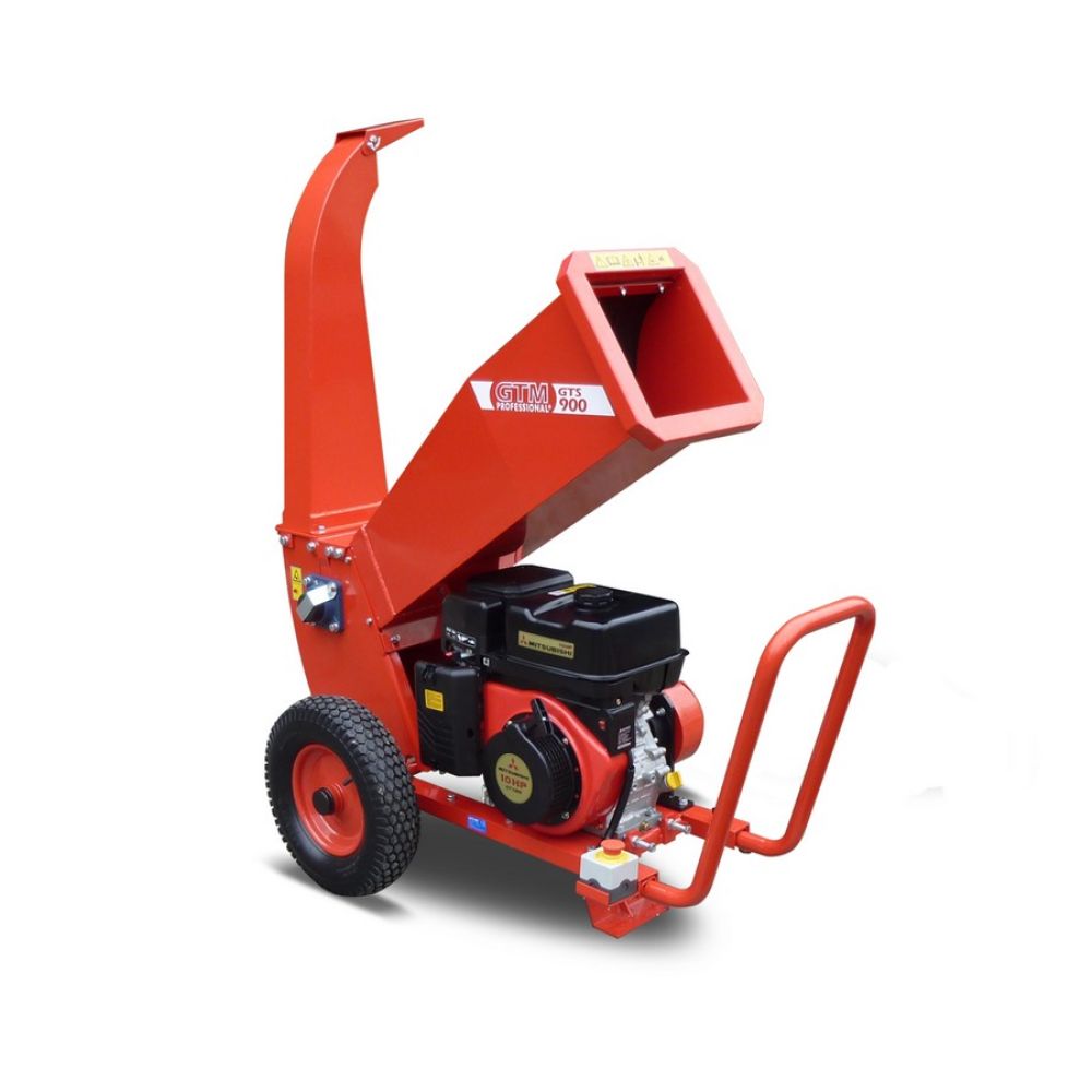 GTM GTS 900M Een sterke houtversnipperaar voor professioneel gebruik. Het mechanisme van deze houtversnipperaar is een 20 centimeter brede trommel waarop 2 messen gemonteerd zijn. Takken tot maximaal 8 cm dikte worden over de hele breedte naar binnen getrokken en vermalen. De houtsnippers worden hoog uitgegooid en zijn door een richtplaat gemakkelijk op te vangen in een krui- of aanhangwagen. De verkregen snippers zijn ideaal als basismateriaal voor tuinpaden of als bodembedekkers. De Mitsubishi motor is de sterkste in zijn segment en overtroeft alle andere motorfabrikanten. Mitsubishi is stiller, verbruikt minder brandstof en olie en trilt minder dan welke motor dan ook. Technische Gegevens: - Motor: Mitsubishi GT1000 - Cilinderinhoud: 296 cc - Motorvermogen: 10 pk / 7.4 kW - Tankinhoud: 6 l tankinhoud - Brandstof: loodvrij 95 - max. diameter materiaal: hout 80 mm - invoerhoogte: 1000 mm - Afmetingen invoer: 250 x 250 mm - Uitworp hoogte: 138 cm - Uitworp deflector: traploos tot 90° aanpasbaar - Noodstop: ja - Diameter wielen: 400 mm - Wielen: met kogellagers - Messen: 2 messen + 1 tegenmes - (l x b x h): 125 x 67 x 138 cm - Gewicht: 132 kg