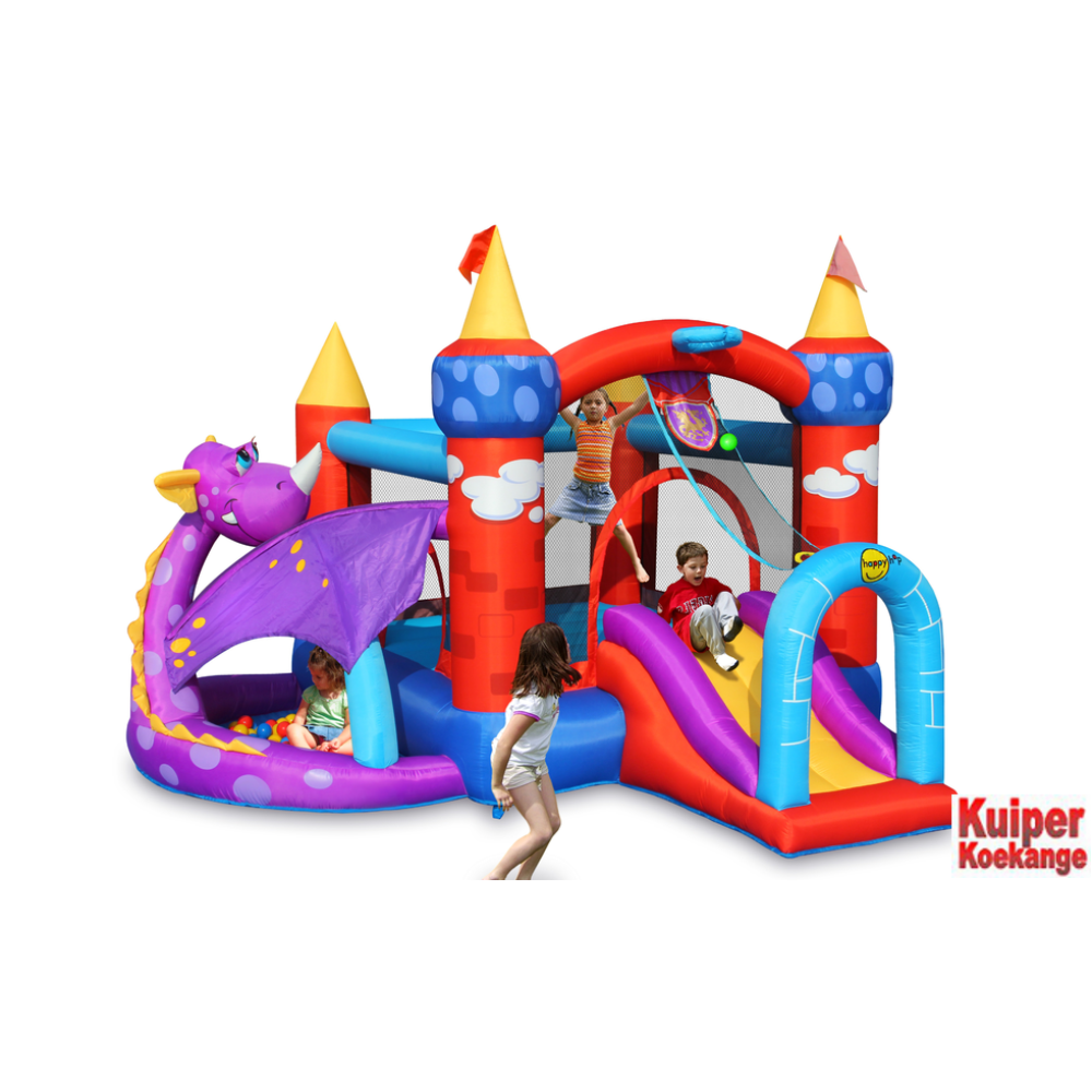 Een springkussen met de uistraling van een kasteel met draak. De Happy Hop Dragon Quest biedt naast een springkussen ook nog een ballenbak, ring gooien en andere leuke spelletjes.