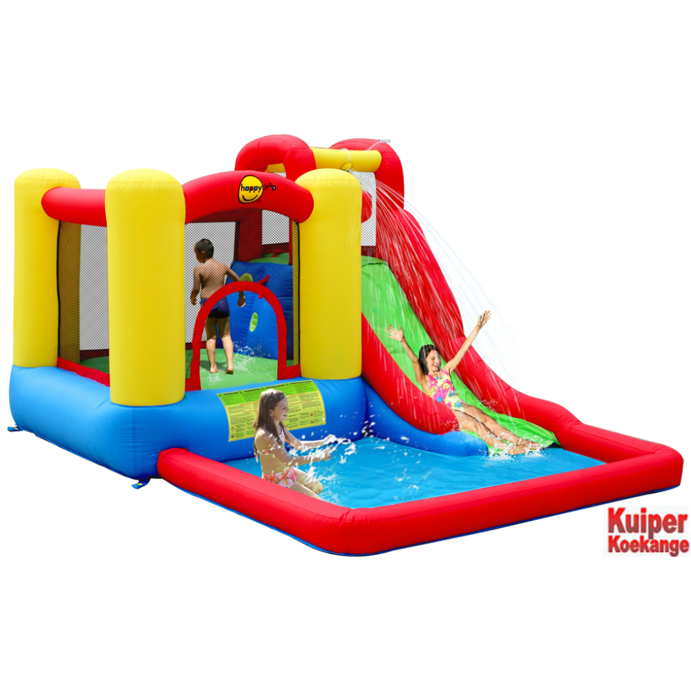 Hier kunnen kinderen de hele zomer door heerlijk op springen en fijn met water spelen! Sluit het springkussen aan op een tuinslang en glij zo het water in. Ook zonder water is de glijbaan te gebruiken.