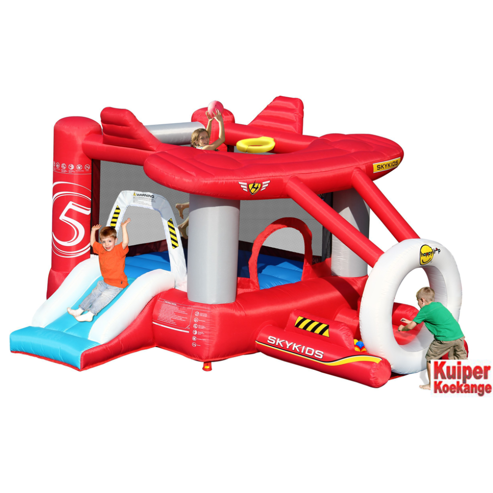 Met dit stoere springkussen spelen uw kinderen dat ze een echte piloot zijn. Opstijgen, vliegen en landen... ze zullen er niet op uitgesprongen raken! Ook bevat dit springkussen nog een basketbalkorf en een ballenbak!