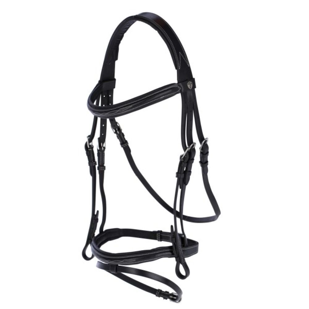 Hoofdstel snaffle classic zwart COB- Mooi trenshoofdstel in klassieke stijl gemaakt van hoogwaardig leer- Aantrekkelijke decoratieve naden in wit voor een elegante look- schouder-, neus- en nekbanden met zachte opvullaag- Inclusief webteugels- Materiaal: Leer- Zonder bit