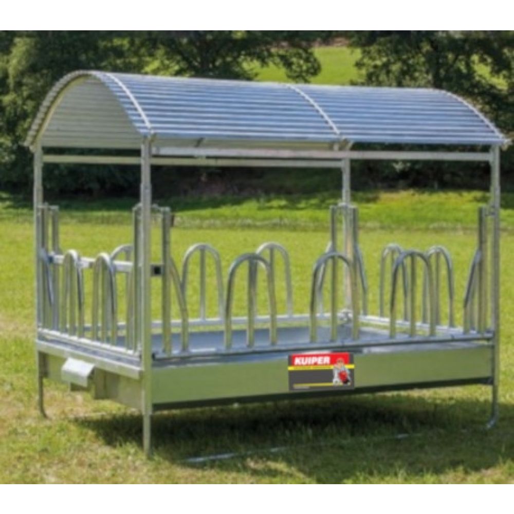 Patura grote balen ruif- Voor 2 ronde balen of 1 grote baal.- 14 Voerplaatsen.- Geschikt voor alle paarden- en runderrassen, ook runderen met hoorns.- Driepuntsophanging.- Dubbele versterkingsbuizen.- Binnenmaat 2,85m x 2,05m.- Voerhoogte 76cm.- Poten en dak in hoogte verstelbaar.- Levering als bouwpakket met montagehandleiding.