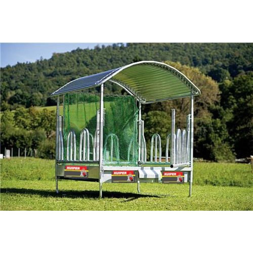 Patura vierkante ruif met universele voerhekken- 12 Voerplaatsen- Geschikt voor alle paarden- en runderrassen- Ook geschikt voor runderen met horens- Driepuntsophanging- Dubbele versterkingsbuizen- Binnenmaat 2,00m x 2,05m- Voerhoogte 76cm- Poten en dak in de hoogte verstelbaar- Levering als bouwpakket met montagehandleiding*Exclusief veiligheidsbeugel, driepuntveiligheidsbeugel en beschermde bitumenlaag!*303530