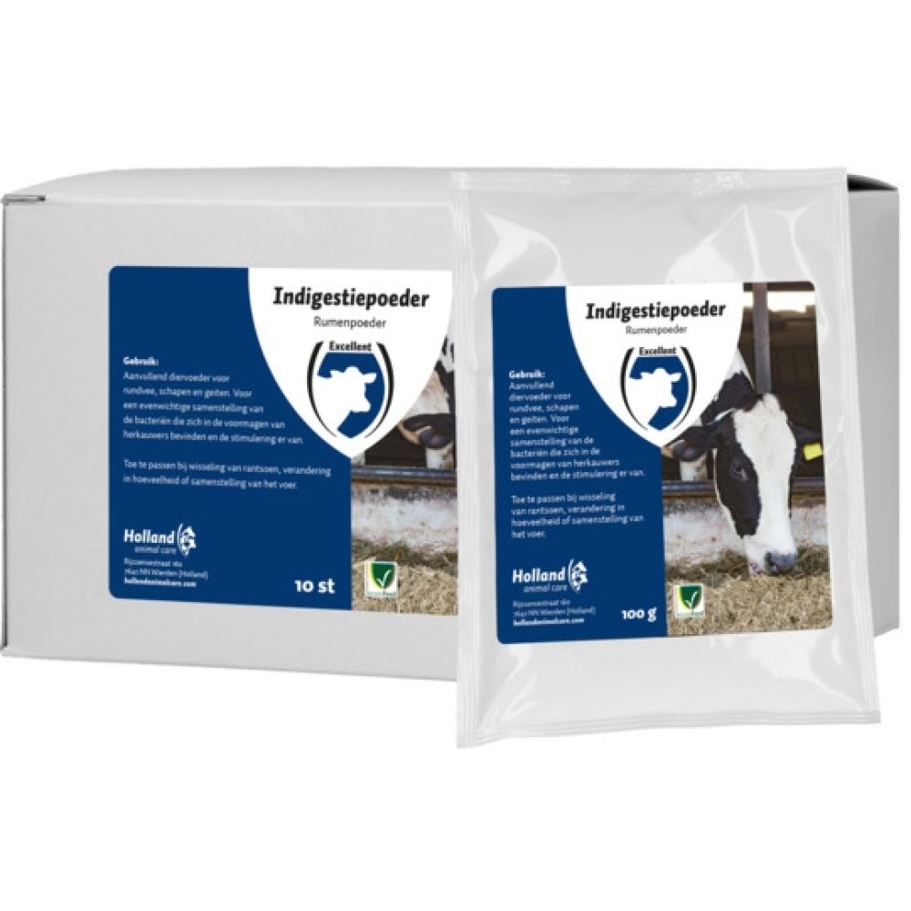 Indigestie poeder - 10 stuksPoeder voor volwassen rund, jongvee, schapen en geiten ter stimulering van de penswerking.Ook wel rumenpoeder, herkauwpoeder of penspoeder genoemd.Bevat een combinatie van: natriumbicarbonaat, natriumsulfaat, gedroogde kruiden (acorus calamus).Aanvullend diervoeder.Voor een evenwichtige samenstelling van de bacteriën die zich in de voormagen van herkauwers bevinden en de stimulering ervan. Toe te passen bij wisseling van rantsoen, verandering in hoeveelheid of samenstelling van het voer.Samenstelling:Natrium - carbonaat, natriumbicarbonaat, natriumsulfaat(karlsbladzout), gedroogde kruiden: acorus calamusAanbevolen gebruiksduur: 1 tot 7 dagen.Voederadvies:Volwassen rund: 2 x daags 100 gJongvee: 2 x daags 50 gSchapen / Geit: 2 x daags 25 gH