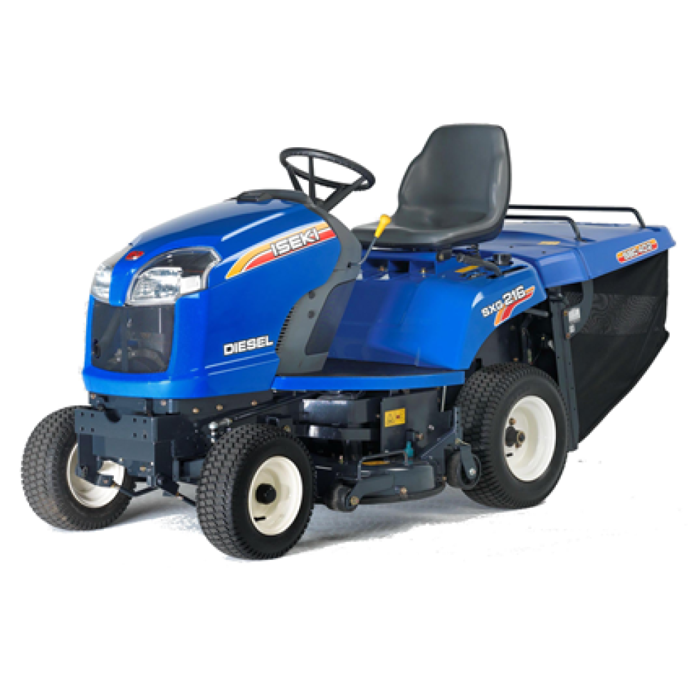 Iseki SXG 216 manuele lediging (via hendel) Ideaal voor grote gazons. - 16 Pk Iseki watergekoelde 2 cilinder dieselmotor. - Hydrostatische aandrijving. - Prachtig maaibeeld, maaibreedte 102 cm. - 2 Naar elkaar draaiende messen met centrale grasopvang. - Perfecte grasopvang in alle omstandigheden. - Aandrijving van de maaier met cardanas. - Opvangbak mechanisch ledigend met een inhoud van 380 liter. - Manuele lediging van de opvangbak of systeem voor elektrisch ledigen in optie. Deze zitmaaier met dieselmotor werd speciaal ontworpen voor tuinaannemers en particulieren die een groot gazon dienen te onderhouden en dit graag met zo weinig mogelijk inspanningen willen doen.