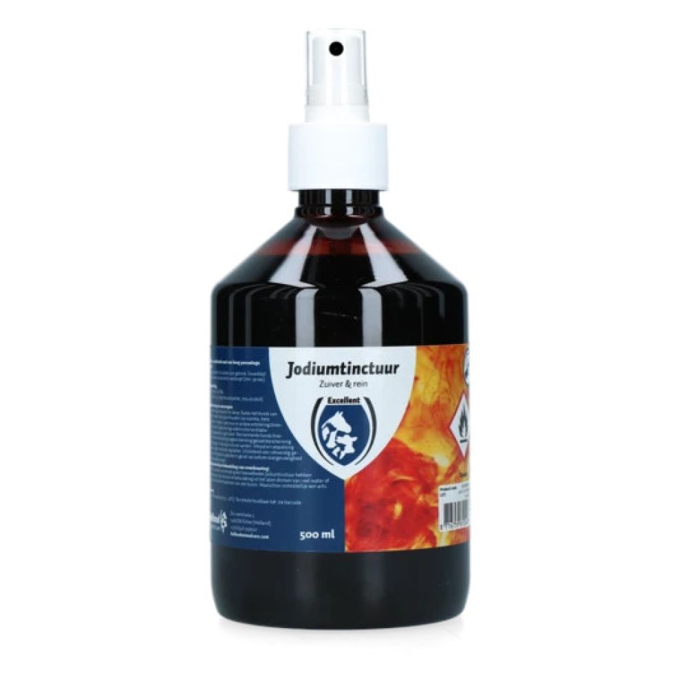 Jodiumtinctuur 1% (10mg per ml) & 70% alcohol - 500mlGebruikSchudden voor gebruik.Inwerktijd eindigt wanneer de alcohol is verdampt (min. 30 sec). SamenstellingJodiumtinctuur 1% FNA (10 mg jodium, 12,5 mg natriumjodide, 70% alcohol) Waarschuwing en voorzorgenLicht ontvlambare vloeistof en damp. Verwijderd houden van warmte/vonken/open vuur/hete oppervlakken. Niet roken. Explosieveilige elektrische/ventilatie-/verlichtingapperatuur gebruiken. Beschermende handschoenen/beschermende kleding/oogbescherming/gelaatsbescherming dragen. Opslag- en opvangreservoir aarden. De inhoud en de verpakking verwerken volgens de nationale voorschriften. Buiten bereik van kinderen houden. Uitsluitend voor uitwendig gebruik. Voorzichtigheid is geboden in geval van jodiumovergevoeligheid en schildklierafwijkingen. Verschijnselen bij en behandeling van overdoseringMocht een persoon onverhoopt grote hoeveelheden Jodiumtinctuur hebben binnengekregen, dan bestaat de behandeling uit het laten drinken van veel water of melk en eventueel het toedienen van een laxans.Waarschuw onmiddellijk een arts. BewaringBewaren bij kamertemperatuur (15-25° C). H
