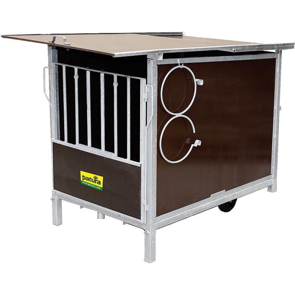 Kalver auto MINI met dakVoor kalveren tot 2 weken.Bewezen voordelen:Boxen met of zonder kalf zijn zeer eenvoudig te transporteren.Hygiene: Vocht loopt door het kunststof rooster wegWarmte van onderen: Het kalf ligt niet direct op de bodemFlexibel dak.Incl. speenemmerhouder. Binnenmaat (L x B): 120 x 80 cmBuitenmaat (L x B x H): 150 x 102 x 145 cmGewicht: 132 kg.1. Dak hoger opklapbaar voor een betere bereikbaarheid van het kalf2. Geoptimaliseerd voerhek inclusief speenemmerhouder3. Bredere wielbasis voor veiliger transport, ook op onevene bodems4. Dolly kan worden omgezet van voor naar achter: Aan te passen naar meerdere situaties.