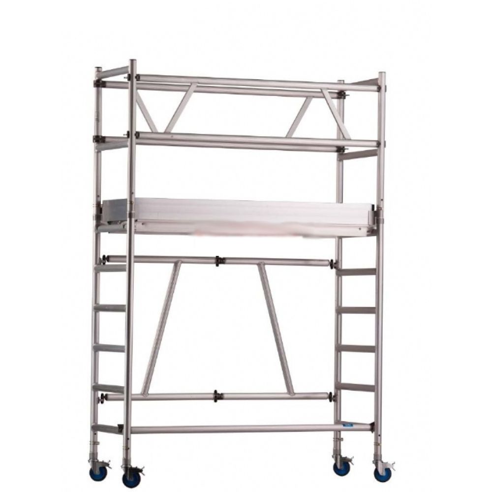 Kamersteiger / vouwsteiger werkh. 5,80m - platf. hoogte 3,80m1x Vouwsteiger: 75x1,85m2x Opbouwframe: 0,75m2x Leuningframe: 0,75m3x Diagonaal schoor: 1,85m1x Horizontaal schoor: 1,85m2x Leuning: 2,45m2x Kantplank: 0,75m2x Kantplank: 1,85m2x Driehoekstabilisator Maakt het schilderen van uw plafond, verven van hoge muren en het reinigen van dakgoten een stuk eenvoudiger.