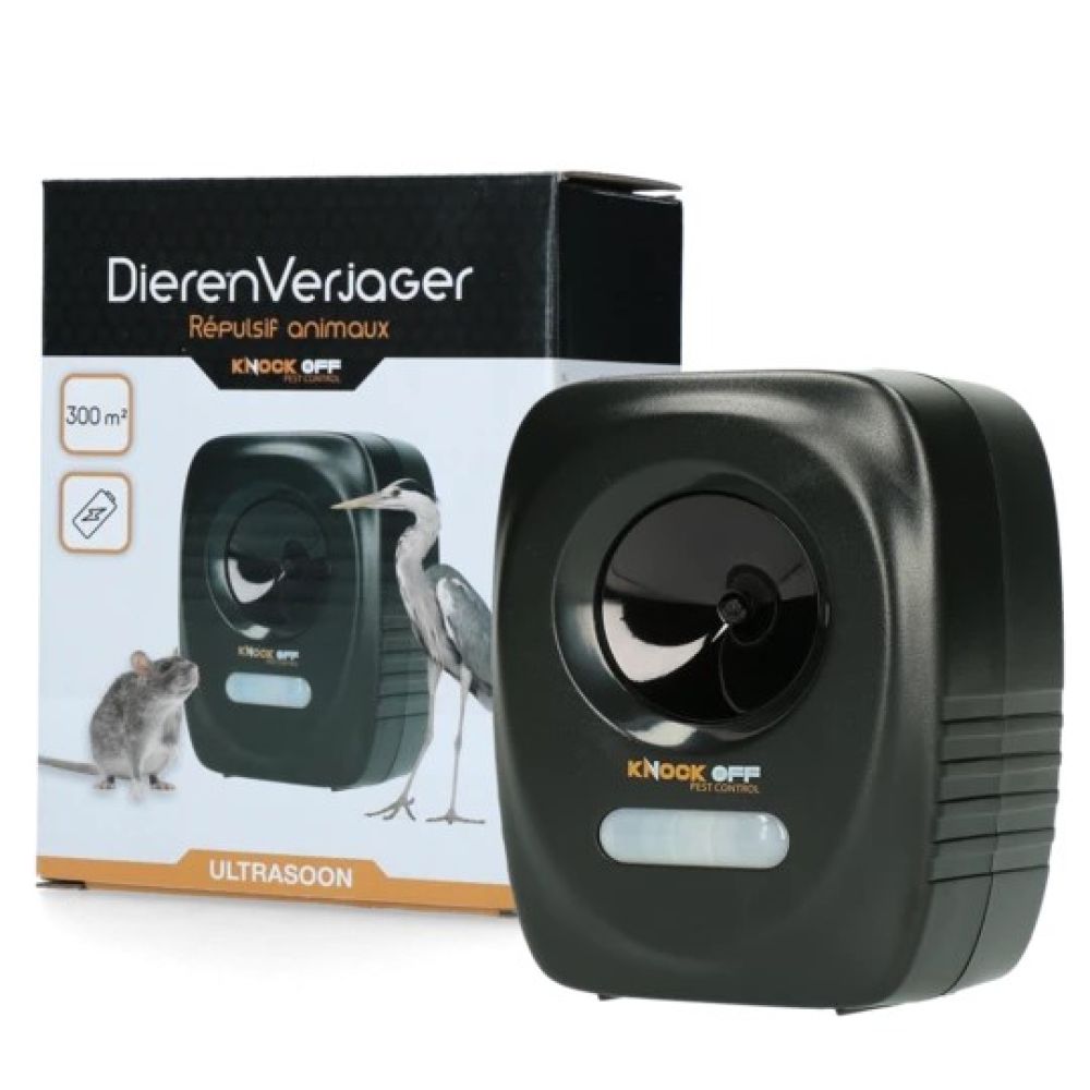 Knock Off Animal RepellerDe Knock Off AnimalRepeller verjaagt meerdere ongewenste diersoorten uit uw tuin, vijver of erf. Het ultrasone signaal is zeer sterk en komt alleen in werking als er dieren (bijv. ratten, honden, vossen, katten, vogels, marters etc.) in de buurt komen. De Knock Off Animal Repeller beschikt over een bewegingsmelder en kan op verschillende manieren ingesteld worden. Zowel ter preventie als ook op het moment dat een ongewenst dier uw erf betreedt. De Knock Off AnimalRepeller werkt op batterijen dus u heeft geen elektriciteit nodig. Werkt tot ca. 8-10 m afstand.