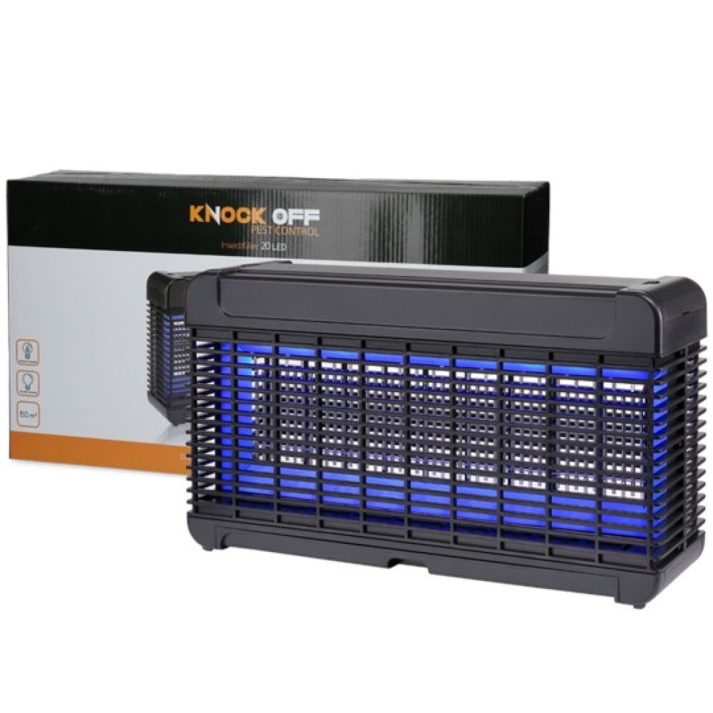 Knock off insectenlamp 20LEDDe Knock Off Insectlamp 20 LED vangt zowel vliegen, muggen en motten. De insectenlamp is voorzien van UV-A LED verlichting en een elektrocutierooster. Deze combinatie zorgt voor uitstekende vangstresultaten. De open vormgeving van de lamp geeft een optimale aantrekking vanuit alle richtingen. Zeer zuinig in gebruik en met een vangstbereik van 150 m2.