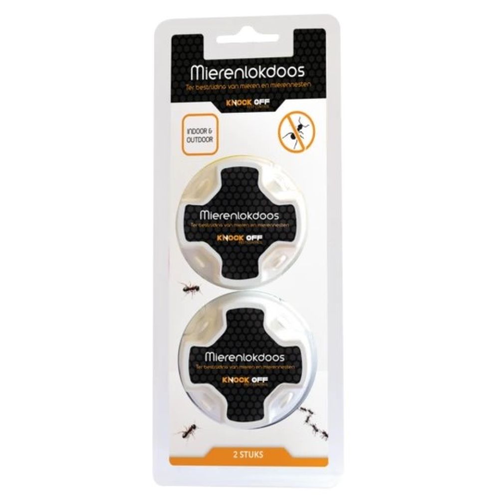 Knock off mierenlokdoos - 2 stuksKnock Off Mierenlokdoos voor het bestrijden van mieren en mierennesten.Gebruiksklare lokdoos voor het bestrijden van zwarte wegmieren (Lasius niger) binnens- en buitenshuis.De zeer smakelijke formulering is onweerstaanbaar voor mieren en zorgt voor effectieve bestrijding van het hele nest en heeft een werking tot 3 maanden.Plaats de lokdoos waar mieren aanwezig zijn; langs mierenpaden of in de buurt van nestingangen.Dosering:1 lokdoos per 15 - 20 m2Werkzame stof:Imidacloprid 0,0204%Toelatingsnummer: NL-0026653-0000Inhoud:2 gram per lokdoosVerpakking: 2 stuksDisplaydoos: 24 sets à 2 stuksGebruik Knock Off Mierenlokdoos veilig. Lees vóór gebruik eerst het etiket en de productinformatie! Zie voor toepassing en gebruik het Wettelijk Gebruiksvoorschrift / Gebruiksaanwijzing.H