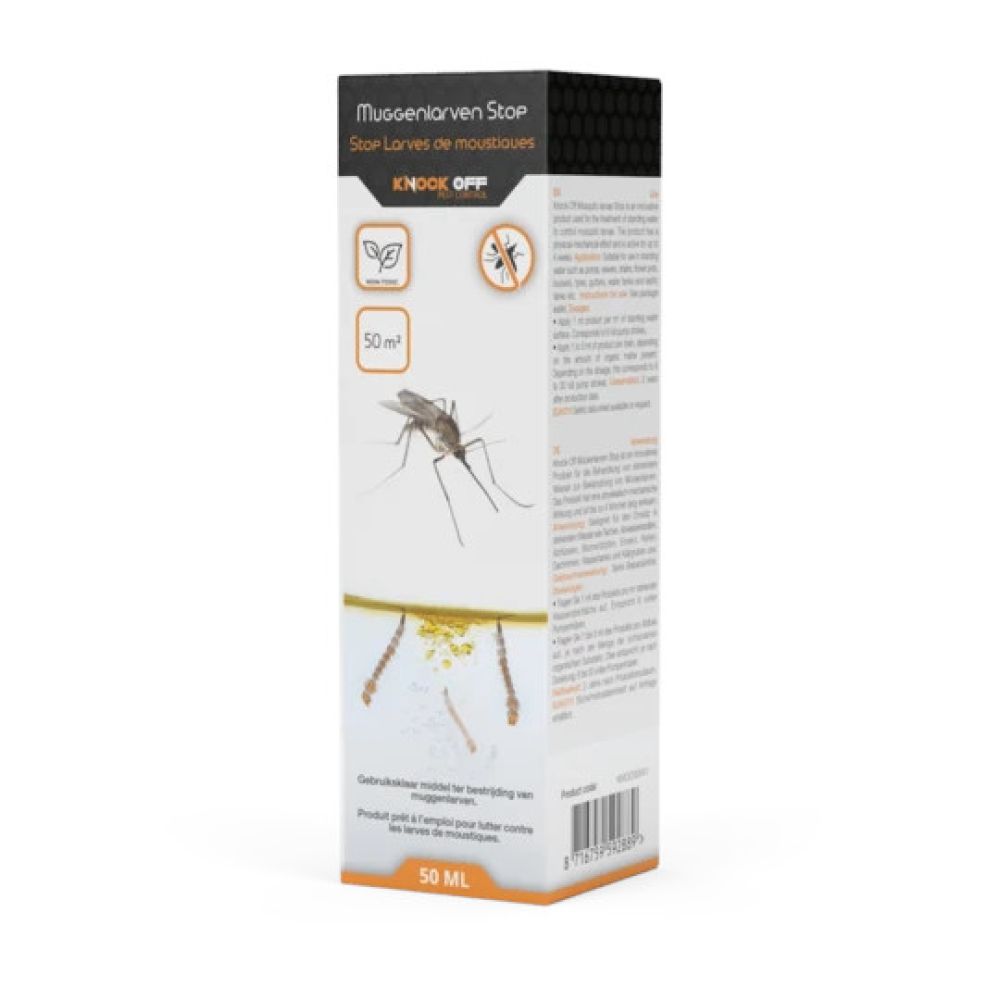 Knock Off Muggenlarven Stop is een gebruiksklaar middel en vormt bij aanbrengen op het wateroppervlak snel een dunne film. Hiermee wordt de ontwikkeling van onvolgroeide stadia van muggen (larven en poppen) voorkomen. De oppervlaktespanning van het water wordt verlaagd en dit zorgt ervoor dat de aanwezige larven en poppen zich niet kunnen hechten aan het oppervlak om de nodige zuurstof uit de lucht te halen. De lage oppervlaktespanning voorkomt tevens dat volwassen muggenvrouwtjes eitjes afzetten, omdat ze bij contact met het behandelde oppervlak vast komen te zitten en in het water zullen zinken.