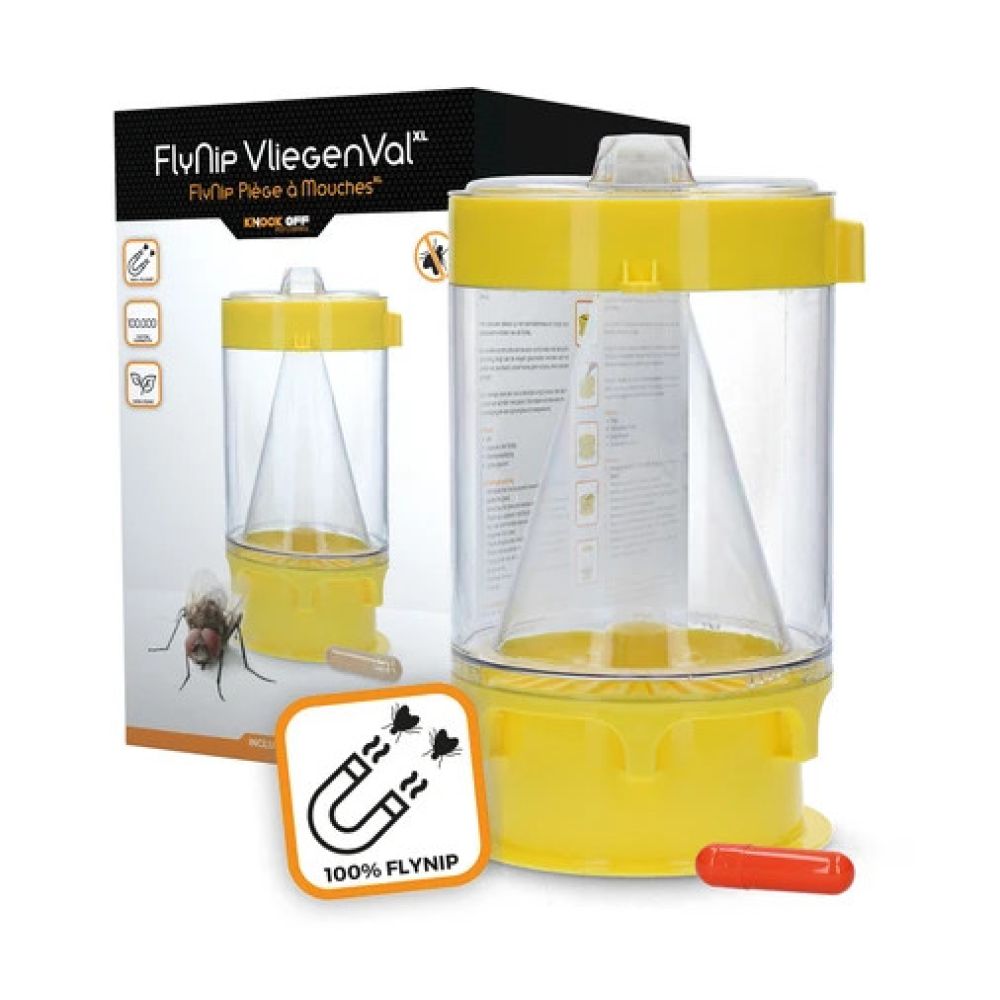 Robuuste, met zeer groot vangreservoir uitgevoerde vliegenval voor maximale capaciteit.Voorzien van het onweerstaanbare lokmiddel FlyNip voor buitenshuis gebruik.Vangt kamer-, stal- en vleesvliegen.Door gebruik te maken van het allerbeste, gifvrije lokmiddel heeft deze vliegenval superieure vangstresultaten.