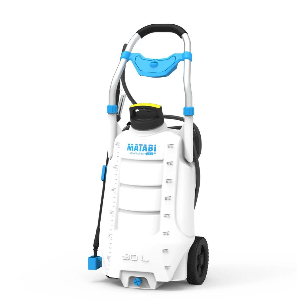 Matabi evolution - 30LDe Matabi Evolution 30 LTC-S, is een baanbrekende elektrische trolley drukspuit op grote wielen met een capaciteit van 30 liter. Deze revolutionaire spuit onderscheidt zich door zijn mobiliteit, duurzaamheid en veelzijdigheid, waardoor het een ideaal hulpmiddel is voor zowel professionele landbouwers, hoveniers, als tuinliefhebbers en voor de professionele schoonmaak en glasbewassing.