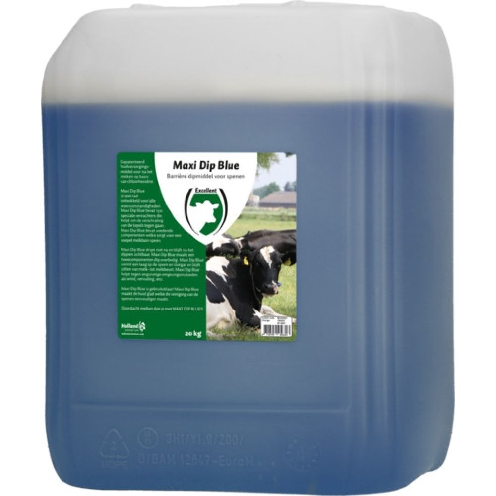 Maxi dip blue - 20kgGepatenteerd huidverzorgings-middel voor na het melken op basis van chloorhexidine.Maxi Dip Blue is speciaal ontwikkeld voor alle weersomstandigheden.Maxi Dip Blue bevat 15% speciale verzachters die helpen om verschraling van de tepels tegen gaan.Maxi Dip Blue bevat voedende componenten die zorgen voor een soepel melkbare speen.Maxi Dip Blue drupt niet na en blijft na het dippen zichtbaar.Maxi Dip Blue maakt een tweecomponenten-dip overbodig.Maxi Dip Blue vormt een laag op de speen en het slotgat en blijft zitten van melk- tot melkbeurt.Maxi Dip Blue helpt tegen ongunstige omgevingsinvloeden als wind, vervuiling enz.Maxi Dip Blue is gebruiksklaar!Maxi Dip Blue maakt de huid glad, wat de reiniging van de spenen eenvoudiger maakt.Doordacht melken doe je met MAXI DIP BLUE!!H