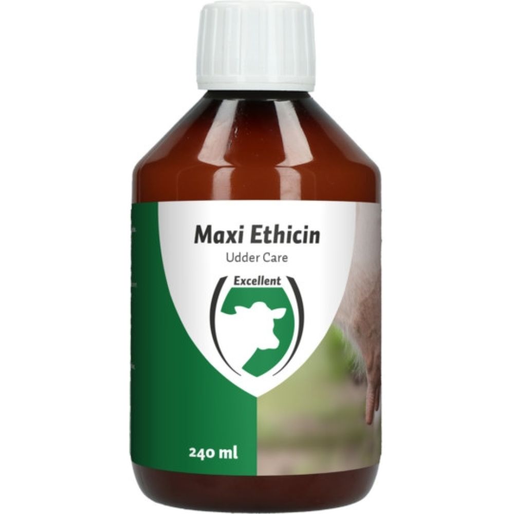 Maxi ethicin uddercare - 240mlMaxi Ethicin ondersteunt het herstellend vermogen en zuivert het kwartier. Geen wachttijd nodig.Voor rundvee en schapen.• Unieke samenstelling.• Trekt supersnel in.• Gemakkelijk in te masseren.• Optimaliseert de natuurlijke weerstand en herstel.• Prijsgunstig.• Bevat géén antibiotica.• Natuurlijk effectief.• Géén wachttijd.• 100% natuurlijk.Toepassen nadat het uier is leeg gemolken.Werkzame stoffenKruiden (Allicin 5,4 mg per 100 ml), etherische olien (Oregano, Lavendel, Tijm, Eucalyptus, Pepermunt, Rozemarijn) en bijenwas. Bijenwas zorgt voor optimale impregnatie / opname.Inhoud 240 ml. Voldoende voor 24 behandelingen.Dosering 2 x daags (10 ml) goed inmasseren.SamenstellingEtherische oliën en kruiden.H