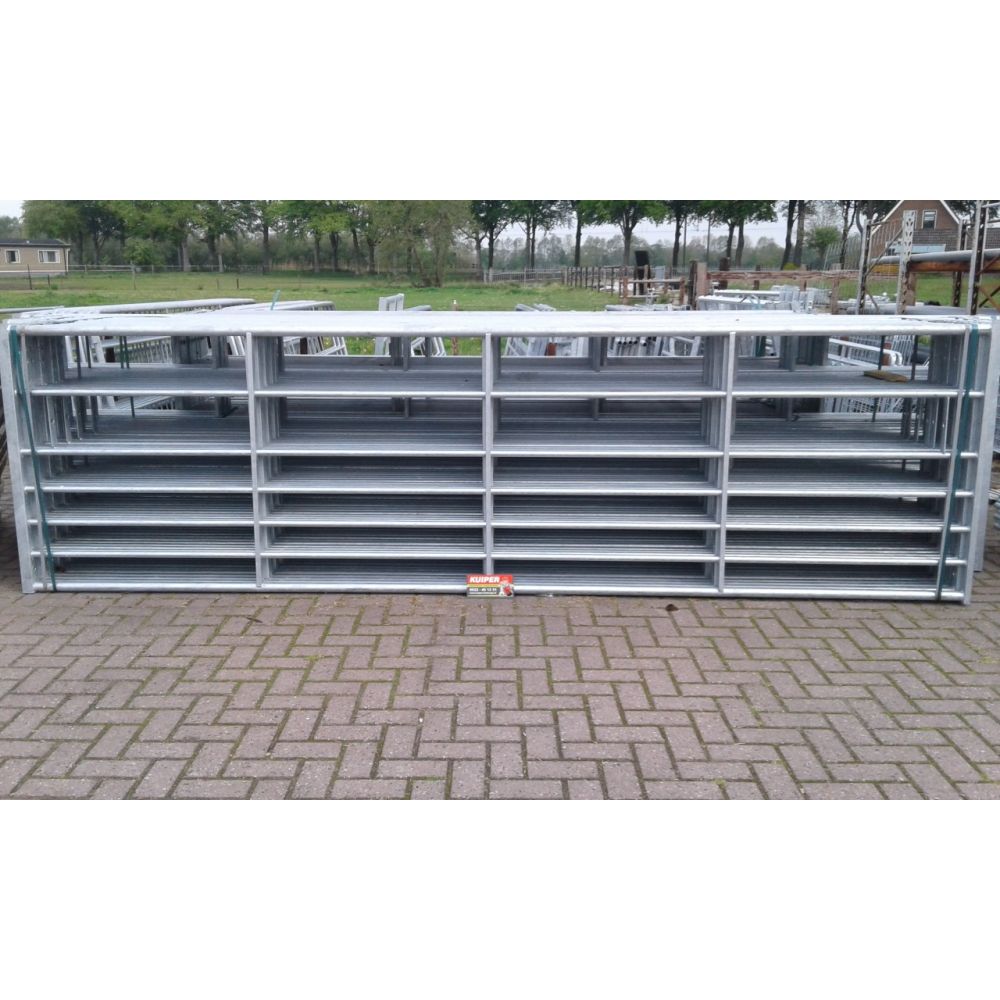 Uitgevoerd in de maten 100cm, 150cm, 200cm, 250cm, 300cm, 350cm, 400cm, 450cm, 500cm en 600cm breed.Hoogte is 110cm.Inclusief ogen en veergrendel.Exclusief duimen.Verkrijgbaar met rechte hoeken.