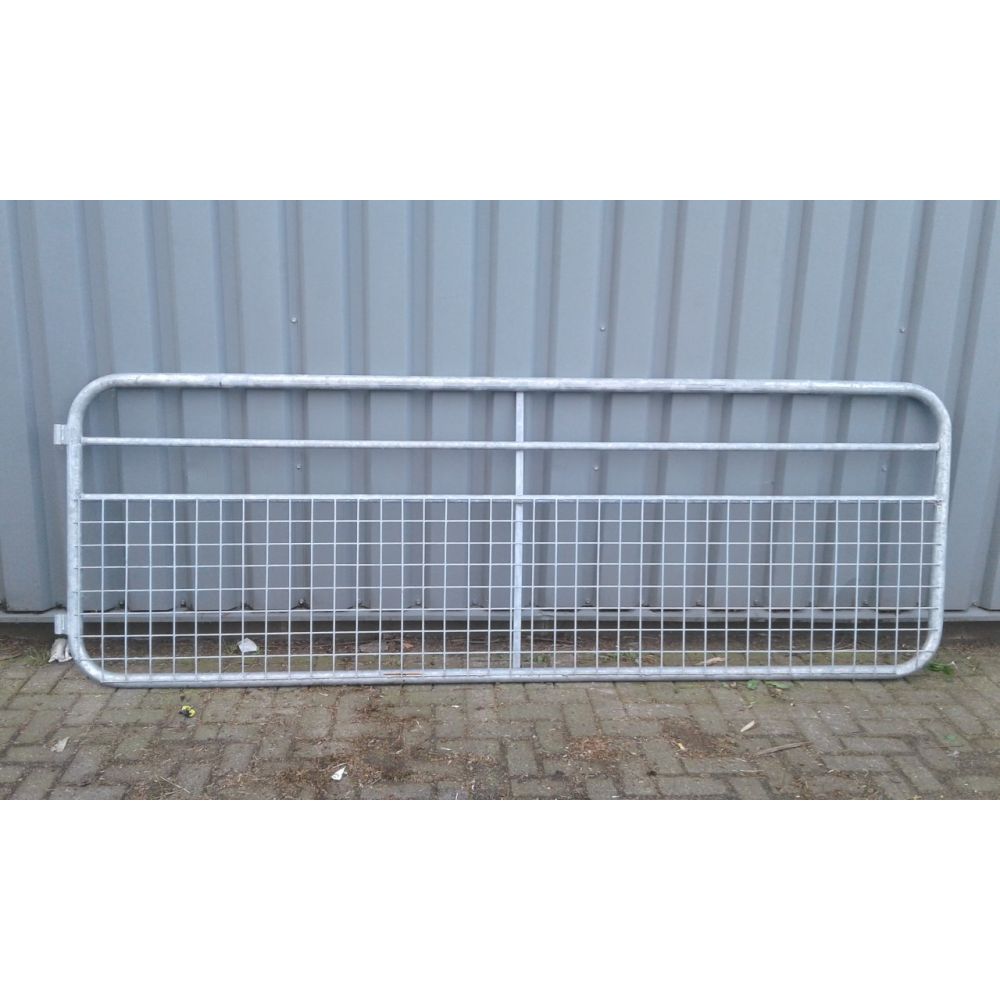 Metalen landhek half gaas verzinkt - ronde hoekenUitgevoerd in 250, 300, 350, 400, 450, 500 en 600cm breed.Wordt exclusief hang- en sluitwerk geleverd.100cm hoog.Verkrijgbaar in ronde hoeken.