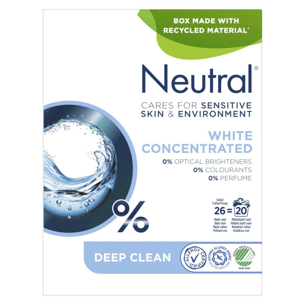 Neutral deep clean waspoeder - 20 wasbeurten - 975grNeutral Parfumvrij Wit Waspoeder is speciaal ontwikkeld voor de gevoelige huid en vermindert het risico op huidreacties. De geur van frisse, schone was is een van de beste momenten die er is. En ook wanneer je een gevoelige huid hebt, wil je dit moment blijven creëren. Neutral Parfumvrij Wit Waspoeder helpt hierbij. Het wasmiddel is hypoallergeen en kleurstof- en parfumvrij. Neutral Parfumvrij Wit waspoeder is ontwikkeld voor de witte was maar ook geschikt voor de gekleurde was. De parfumvrije formulering maakt je kleding effectief schoon en is bovendien mild voor je huid en voor je kleding. Het wasmiddel bevat 0% parfum en 0% kleurstof. Uiteraard is het wasmiddel ook dermatologisch getest en goedgekeurd. Neutral Parfumvrij Wit Waspoeder verwijdert vlekken effectief en houdt de kleur van je was langer stralend wit. Bovendien zijn de ingrediënten die Neutral gebruikt milieuvriendelijk, waardoor ze worden aanbevolen door diverse organisaties uit onder andere Noorwegen en Denemarken. Neutral is mild en hierdoor geschikt voor alle huidtypen en leeftijden! De doos van Neutral Wit Waspoeder is gemaakt van minstens 96% gerecycled materiaal.Neutral Parfumvrij Wit Waspoeder is effectief tegen vuil en vlekken en mild van samenstelling om het risico op huidirritatie te verminderen.