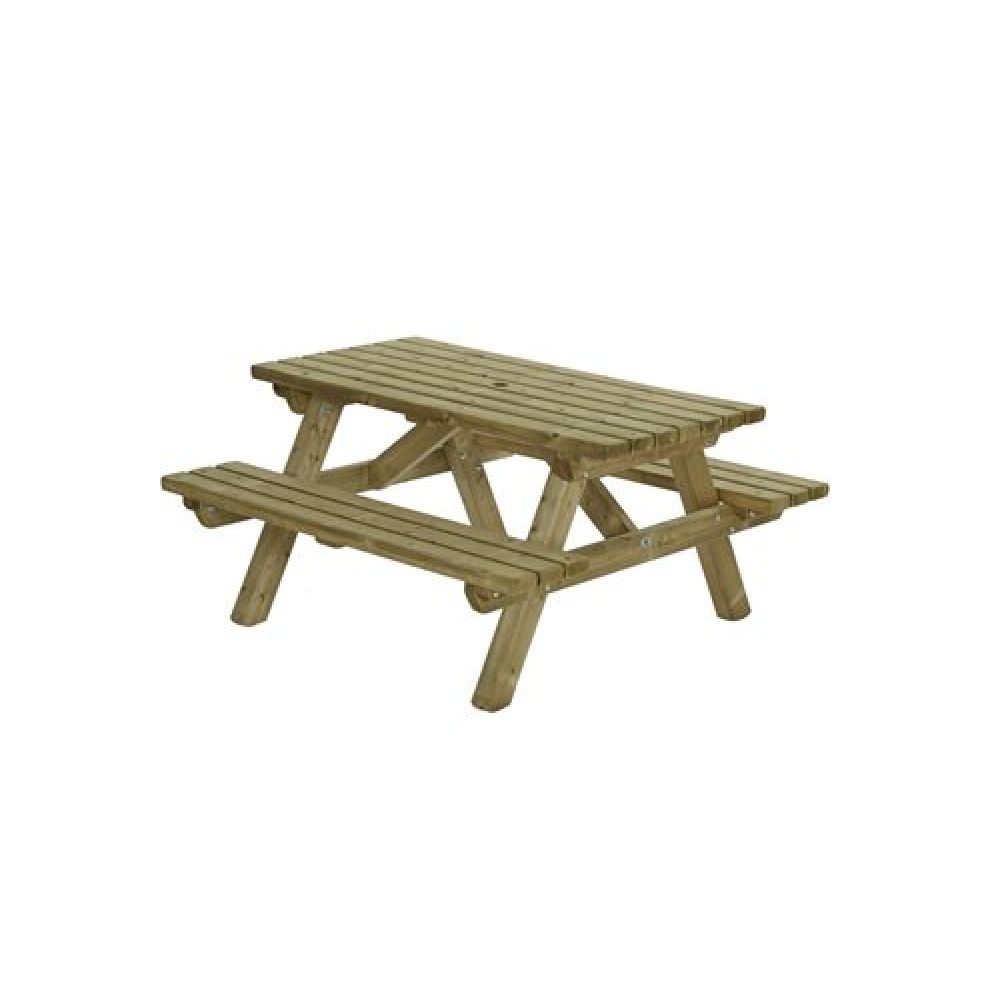 Picknicktafel rechthoek 45mm dik geïmpregneerd - 150cmGemaakt van verduurzaamd vurenhout.Deze grote picknicktafel wordt geleverd met een parasolopening van 50mm.Afmetingen:Lengte 150cmBreedte 150cmBladhoogte 76cmZithoogte 46cm
