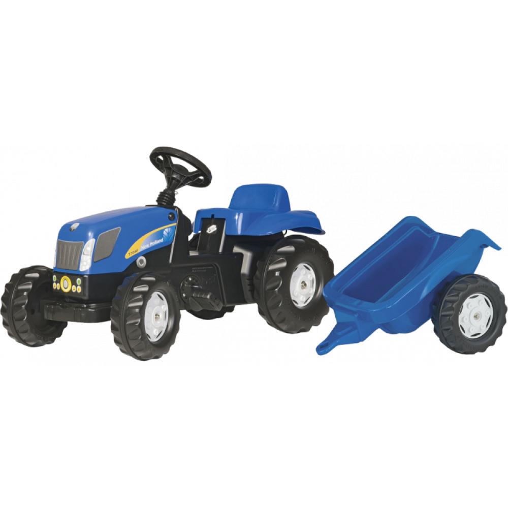Rollykid New Holland T 7040De rollyKid is het kleinste model traptractor uit de Rolly Toys productlijn. Hij is geschikt voor kinderen vanaf 2½ jaar en ideaal voor de overstap van loopauto naar trapauto. De rollyKid New Holland is standaard uitgerust met een aanhanger om allerlei spulletjes mee te vervoeren. De motorkap kan geopend worden, terwijl de kettingkast geheel is afgeschermd.