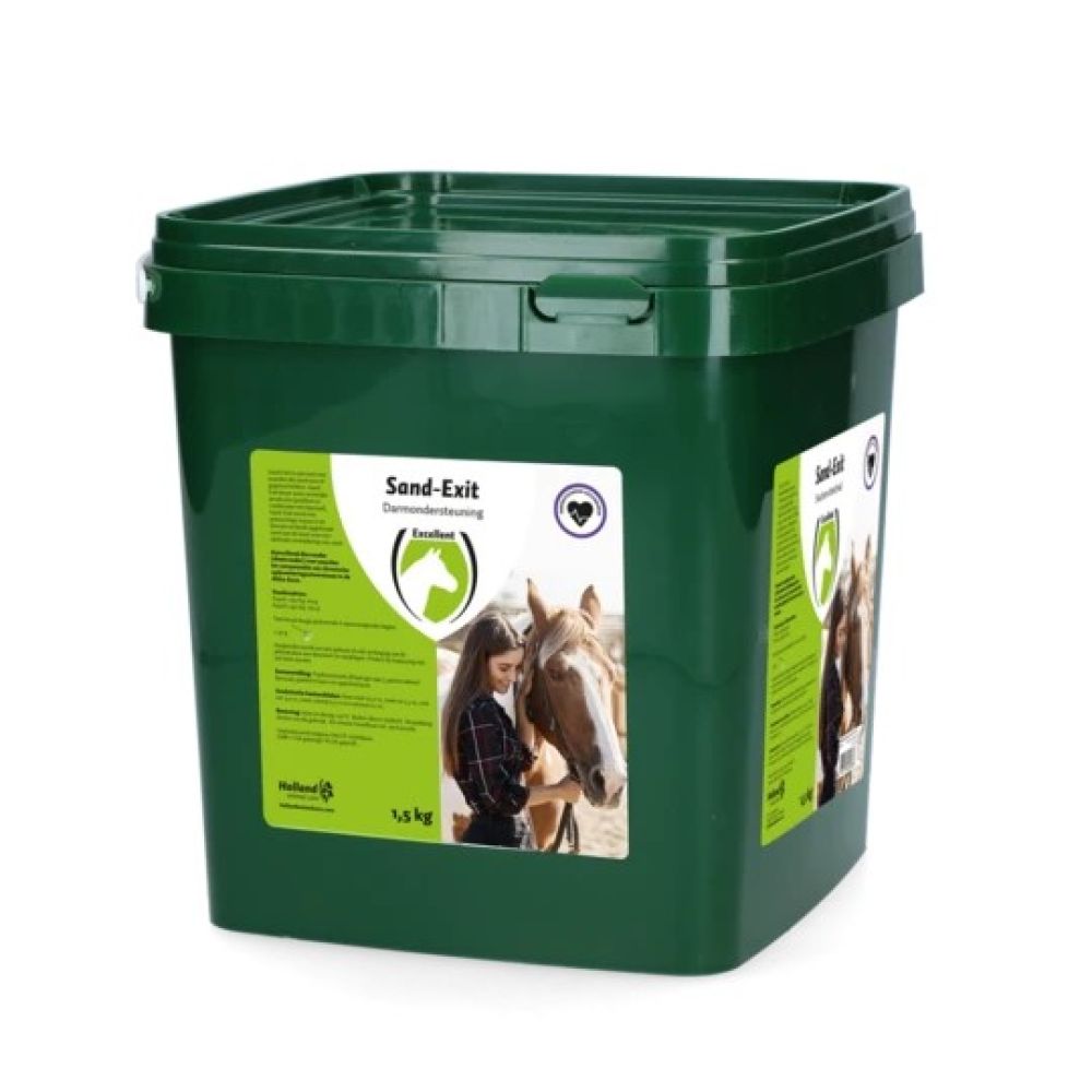 Speciaal voor optimale verwijdering van zand in het darmkanaal en ter ondersteuning van de darmpassage. Aanvullend diervoeder voor paarden.Sand-Exit bevat vezelrijke bronnen, zoals psylliumvezels en geëxtrudeerd lijnzaad ter ondersteuning van een goede darmwerking.Sand-Exit vormt een geleiachtige massa in de darmen en bindt opgehoopt zand aan de mest om vervolgens het paardenlichaam te verlaten.Sand-Exit is in muesli vorm en erg smakelijk door de toegevoegde appelaroma. Zeer goed opneembaar voor het paard. Psyllium in combinatie met lijnzaad voor optimale verwijdering van zand en ondersteuning van de darmwerking. Wanneer heeft het paard last van opgehoopt zand in het darmkanaal?Dit is eenvoudig te testen door een halve emmer te vullen met water en 5 Ô 6 mestballen toe te voegen. Laat de emmer een uur staan en controleer nadien de inhoud. Ligt er meer dan 1 theelepel zand op de bodem van de emmer, dan heeft het paard te veel zand binnengekregen. Het advies is om het paard Sand-Exit te geven, ter voorkoming van onder andere darmongemakken. VoederadviesPaard tot 450 kg: 60 g twee keer per dag gedurende 6 dagen.Paard vanaf 450 kg: 125 g twee keer per dag gedurende 6 dagen.
