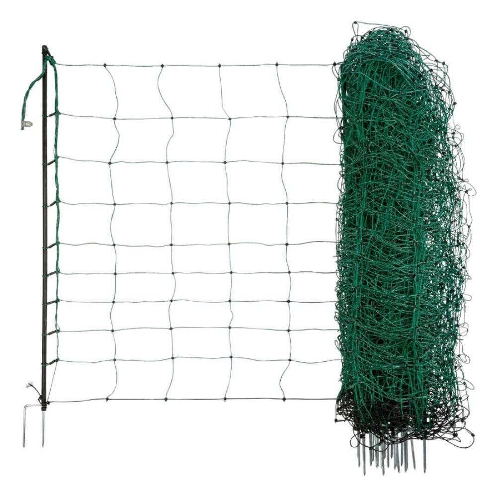 Schapennet 90cm hoog, 22m groen dubbele pootHoogte 90 cm (9 horizontale polydraden).Stevige kunststofpalen met gegalvaniseerde onderpunt.Horizontale stroomgeleiding met 3 x 0,20 mm roestvrijstalen geleiders per polydraad.Versterkte, onder spanning staande bovenste polydraad - verhoogde geleiding dankzij het gebruik van 5 roestvrijstalen draden en een vertinde koperdraaduiterst stabiele gelaste knopen.Kopisolator en aardingsstopper maken zelflosraken van de polydraad vrijwel onmogelijk.Bijzonder geschikt voor gebruik met meerdere netten achter elkaar.Optimale stroomtoevoer naar het meest afgelegen schapennet, dankzij gegalvaniseerde kopergeleider in de bovenste draadstreng. 20 keer hogere geleiding dan standaardnetten!