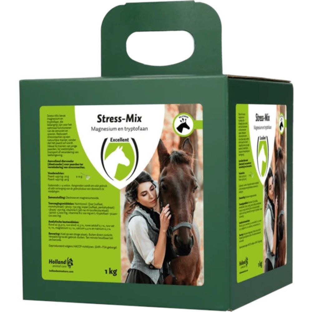 Stress Mix is 100% natuurlijk en op basis van aminozuur L-tryptofaan, hoog aandeel aan magnesium met toegevoegde vitaminen en mineralen. L-tryptofaan en magnesium zijn belangrijk voor een normale werking van de zenuwen en spieren. Stress Mix ontspant en geeft rust op natuurlijke wijze, zodat het paard optimaal kan presteren.