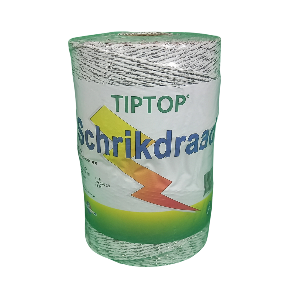 Dit witte TipTop draad van 400 meter is een betrouwbare keuze voor diverse afrasteringstoepassingen. Met een diameter van 3mm en negen roestvrijstalen geleiders (9x0,2mm) biedt het uitstekende geleiding en duurzaamheid. De lage weerstand van 2,94 Ohm/m zorgt voor efficiënte stroomoverdracht, terwijl de breekkracht van 110kg robuuste bescherming biedt. Het PE-materiaal maakt het draad weerbestendig en geschikt voor zowel tijdelijke als permanente afrasteringen in landbouw, veeteelt en terreinafscheiding.