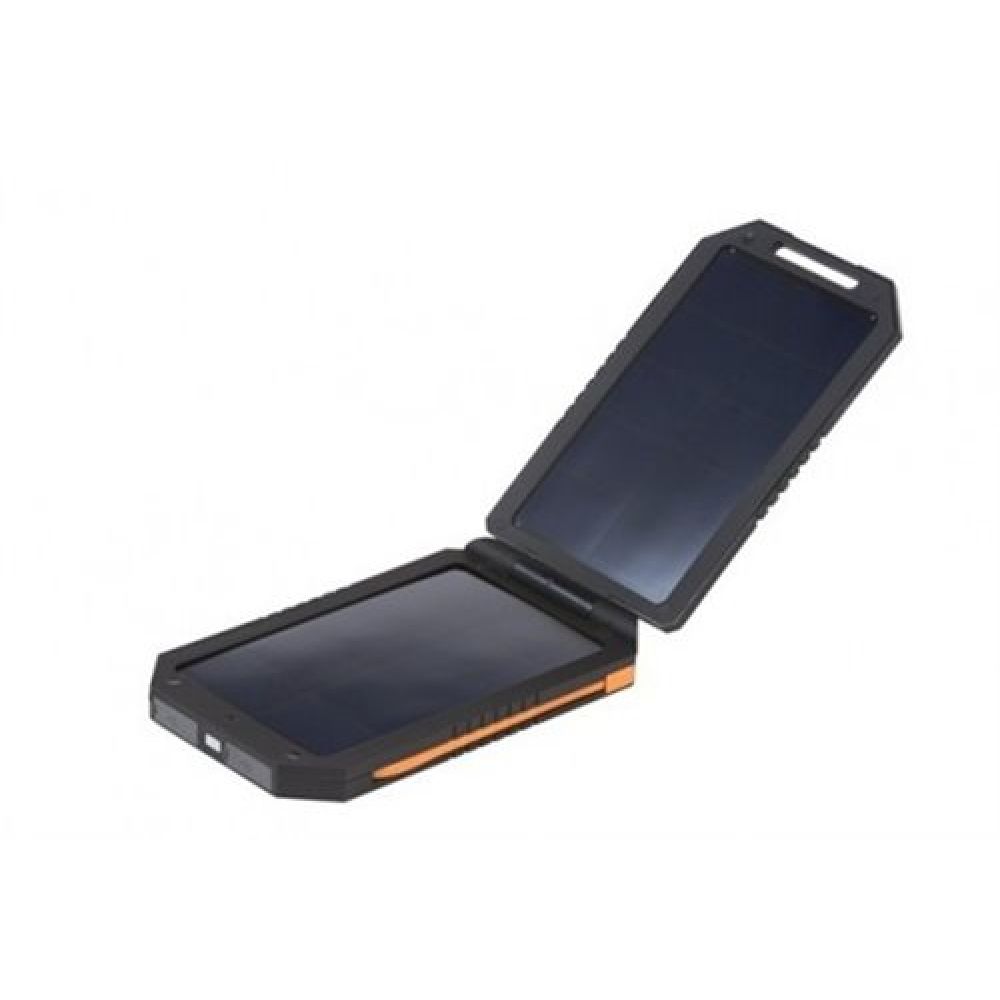 Stoere universele outdoor-charger met rubber-afwerking. Voorzien van krachtig 3.5Watt zonnepaneel voor een extra snelle laadtijd via zonlicht.