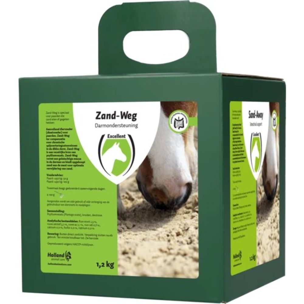 Speciaal voor het verwijderen van zand in het darmkanaal en ter ondersteuning van de darmpassage. Aanvullend diervoeder voor paarden.Zand-Weg bevat de vezelrijke bron psyllium en ondersteunt een goede darmwerking.Zand-Weg vormt een geleiachtige massa in de darmen en bindt opgehoopt zand aan de mest en om vervolgens het paardenlichaam te verlaten. Psyllium voor verwijdering van zand en ondersteuning van de darmwerking. Wanneer heeft het paard last van opgehoopt zand?Dit is eenvoudig te testen door een halve emmer te vullen met water en 5 á 6 mestballen toe te voegen. De emmer een uur laten staan en nadien de inhoud controleren. Als er meer dan 1 theelepel zand op de bodem van de emmer ligt, heeft het paard te veel zand binnengekregen. Het advies is om het paard Zand-Weg te geven, ter voorkoming van onder andere darmongemakken! VoederadviesPaard tot 450 kg: 50 g twee keer per dag gedurende 6 dagen.Paard vanaf 450 kg: 100 g twee keer keer per dag gedurende 6 dagen.